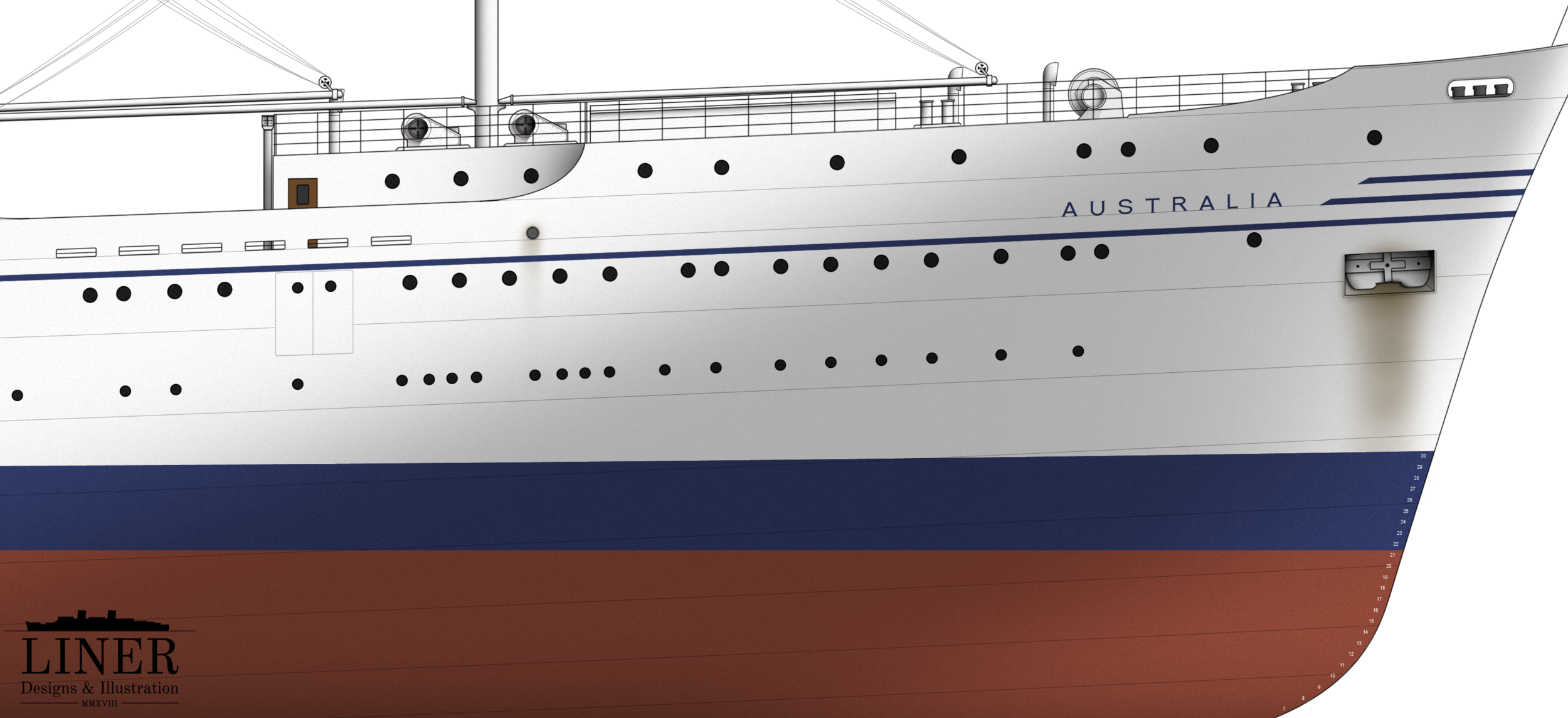 Australia’s elegantly raked single funnel bore the Lloyd-Triestino colours.