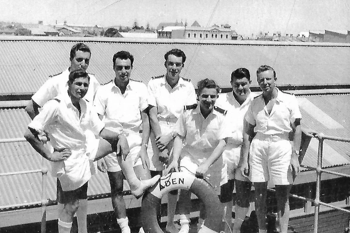 Ken (centre, back) on his second voyage with other Engineers and Officers aboard SS Aden in 1955. Mo is standing to Ken’s right.